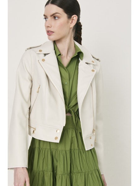 Expertly crafted with vegan leather, the Theodora Jacket boasts a luxurious off-white hue and elegant gold hardware. Elevate your wardrobe with this sophisticated piece.